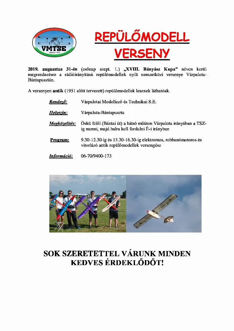 Program: 9.30-12.30-ig és 13.30-16.30-ig elektromos, robbanómotoros és vitorlázó antik repülőmodellek versengése