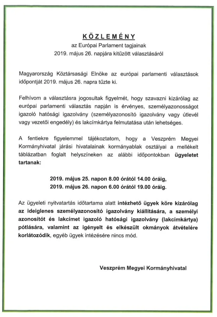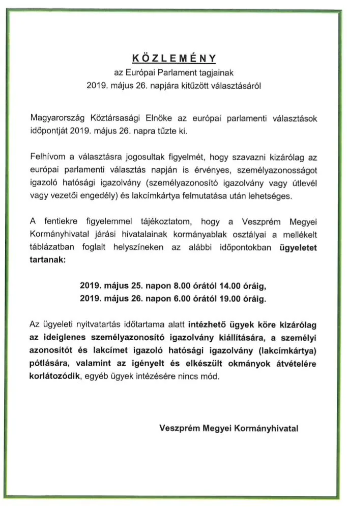 2019. május 26. napon 6.00 órától 19.00 óráig.