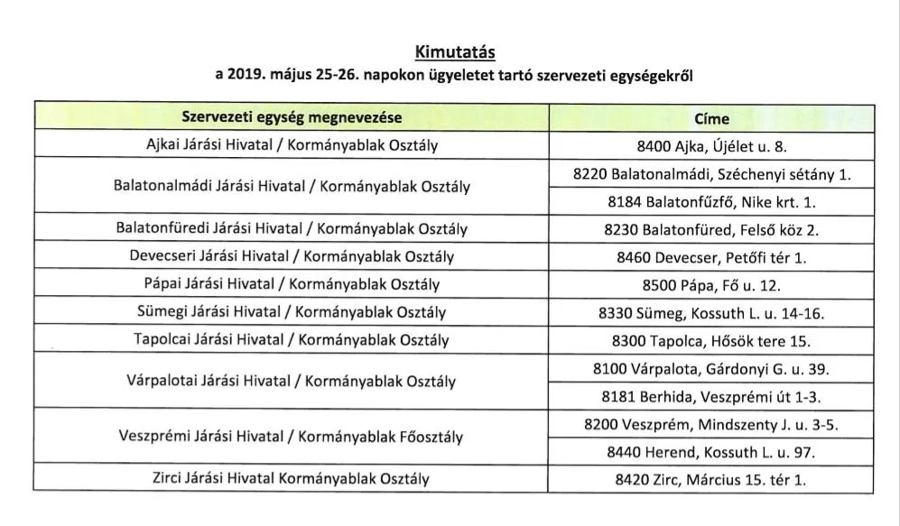 A Veszprém Megyei Kormányhivatal járási hivatalainak kormányablak osztályai ügyeletet tartanak: