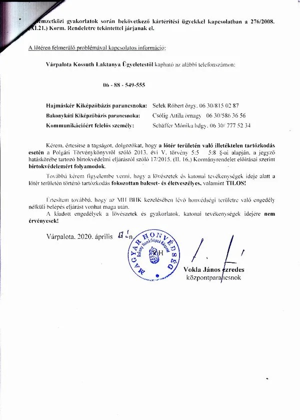 Lőtérértesítő Közszolgálati hír a MH Böszörményi Géza Csapatgyakorlótér Parancsnokság kezelésében lévő honvédségi területeken.