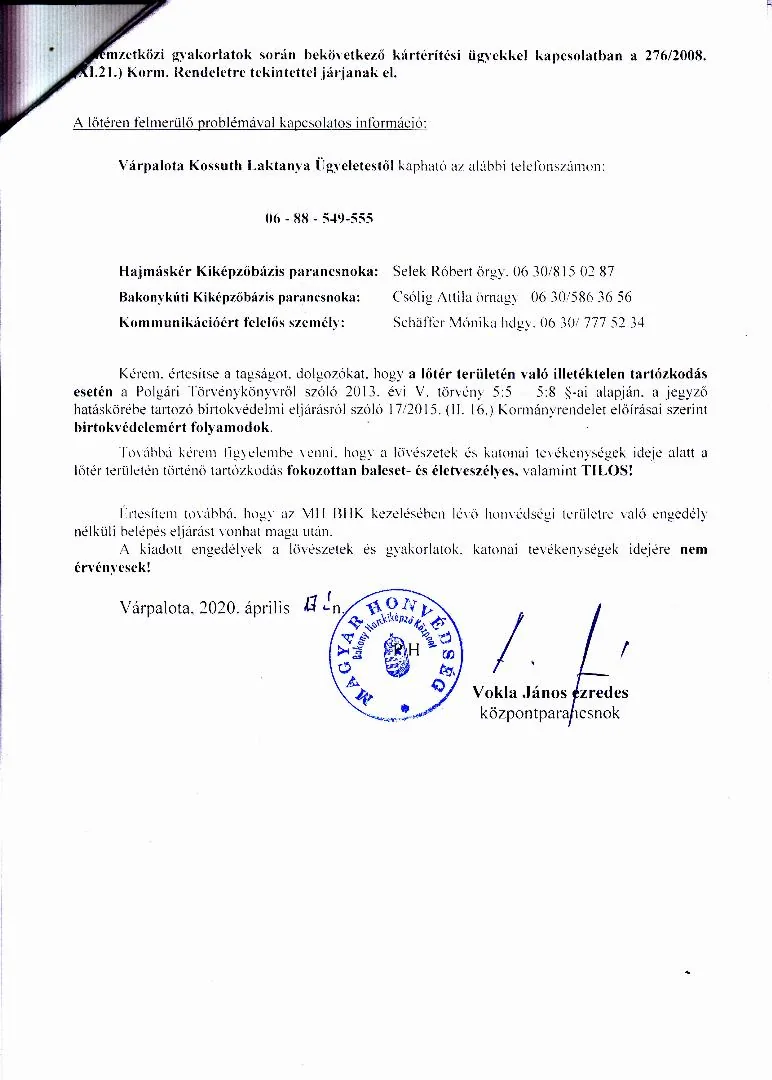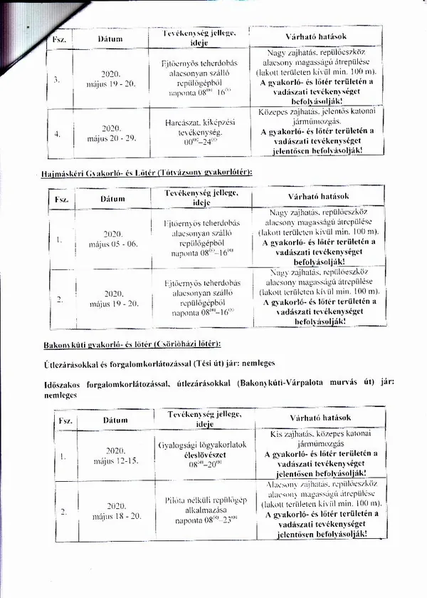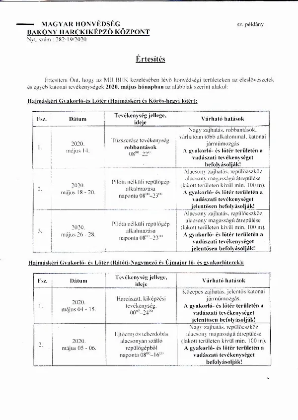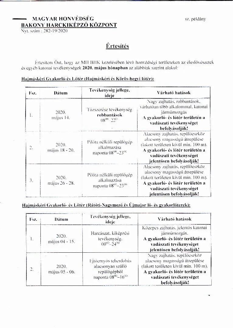 2020. május havi lőtérértesítő és a 2020. április hónapban törlésre kerülő gyakorlatokat