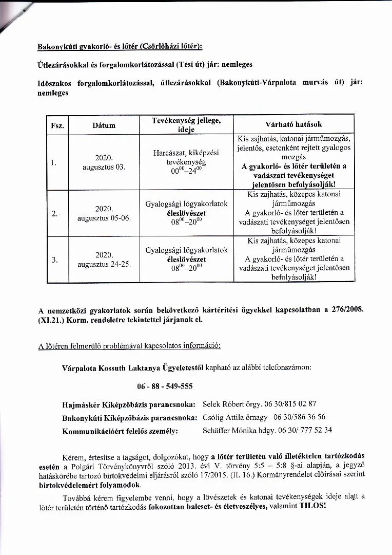 BAKONY HARCKIKÉPZŐ KÖZPONT honvédségi területein az éleslövészetek és egyéb katonai tevékenységek alakulása.
