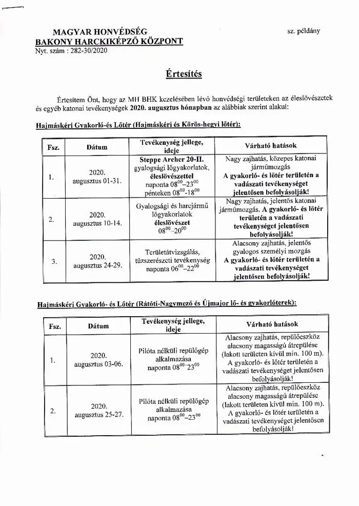 Lőtérértesítő Közszolgálati hír a MH Böszörményi Géza Csapatgyakorlótér Parancsnokság kezelésében lévő honvédségi területeken.