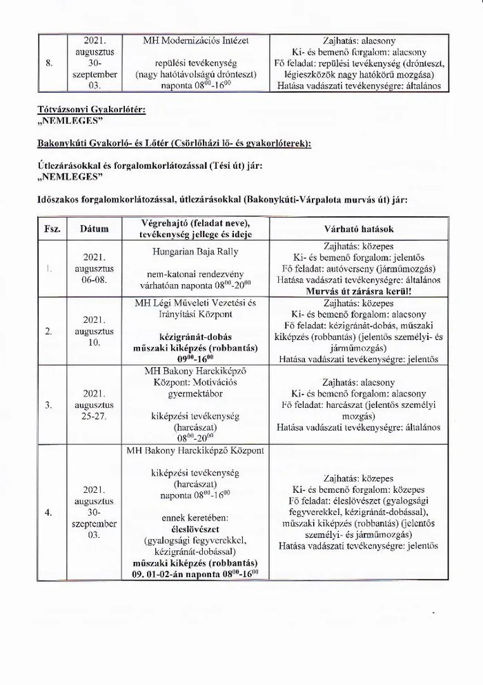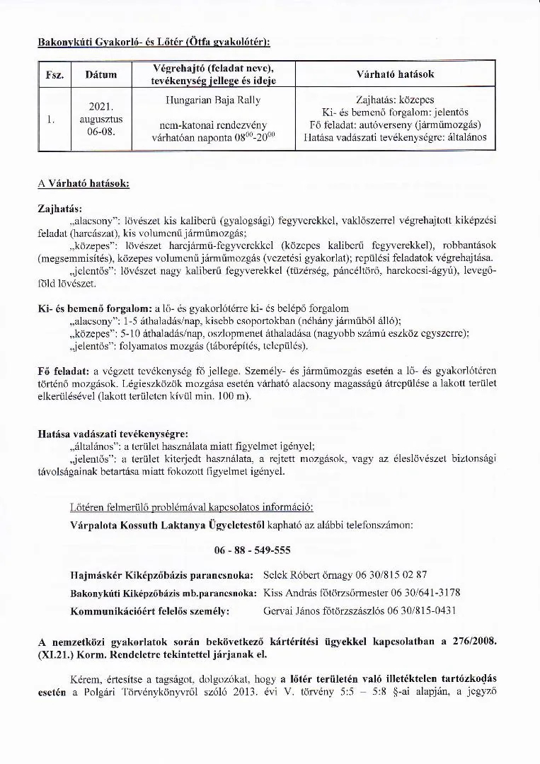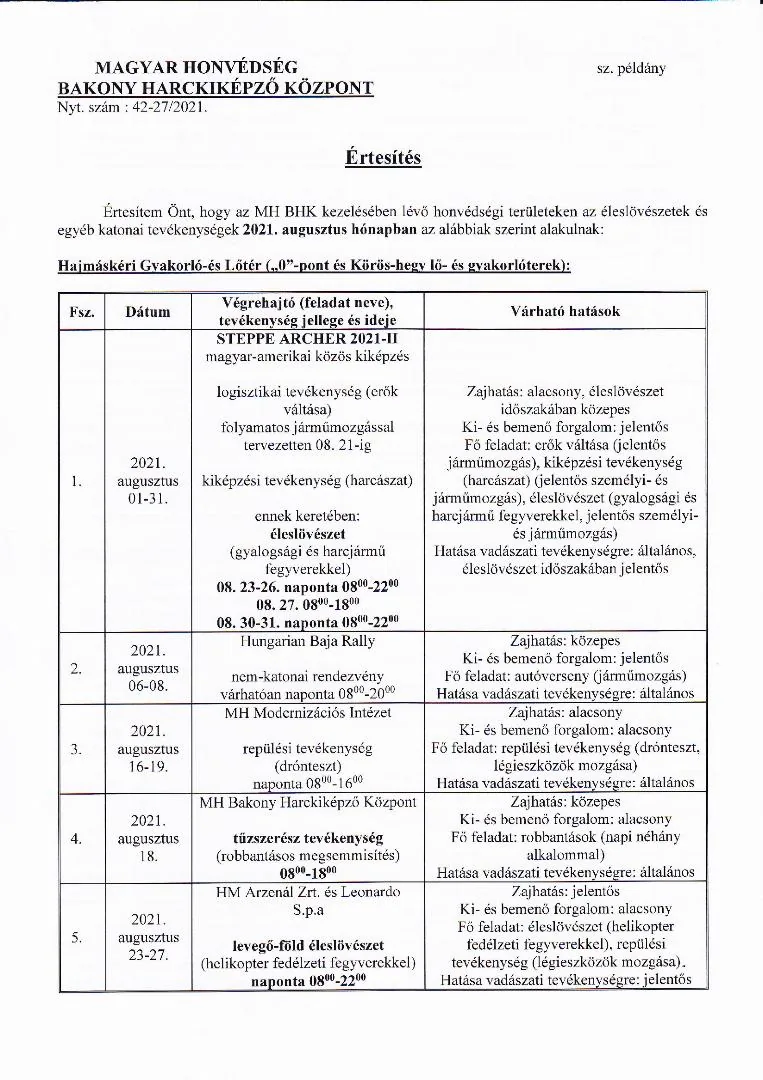BAKONY HARCKIKÉPZŐ KÖZPONT honvédségi területein az éleslövészetek és egyéb katonai tevékenységek alakulása.
