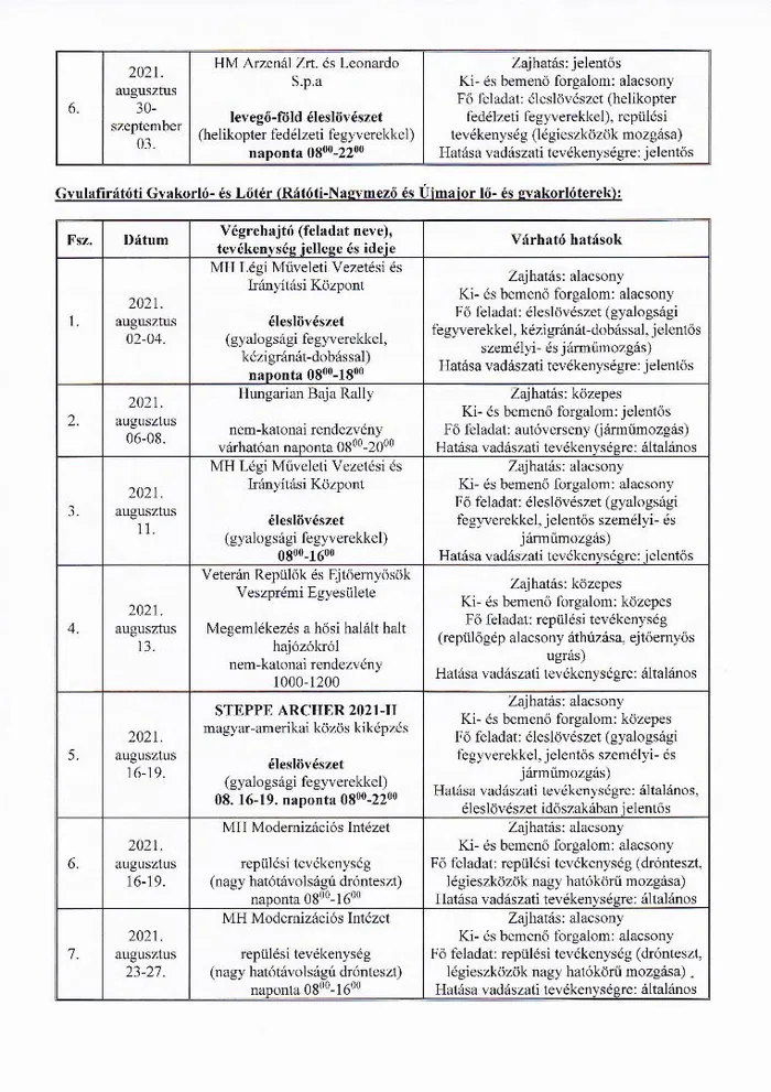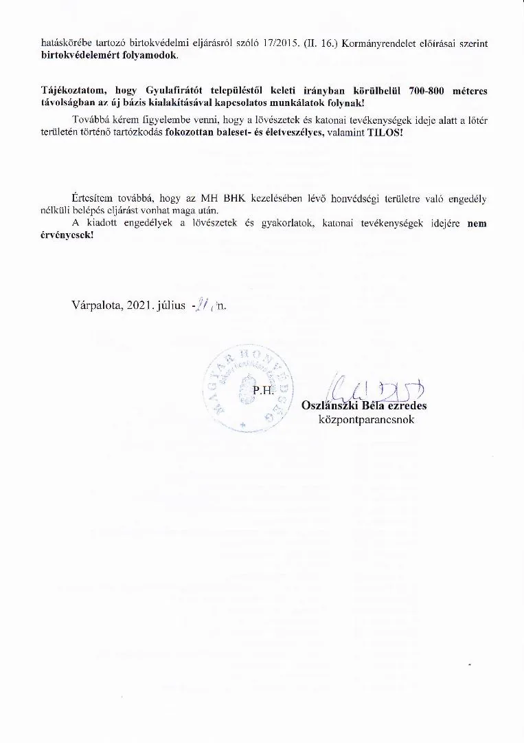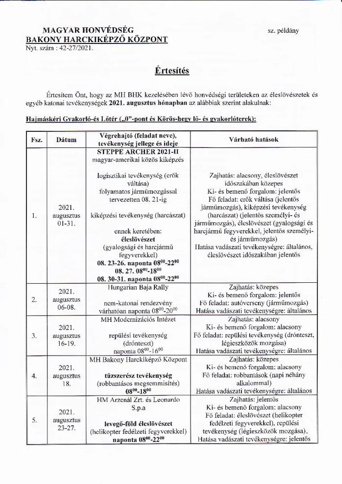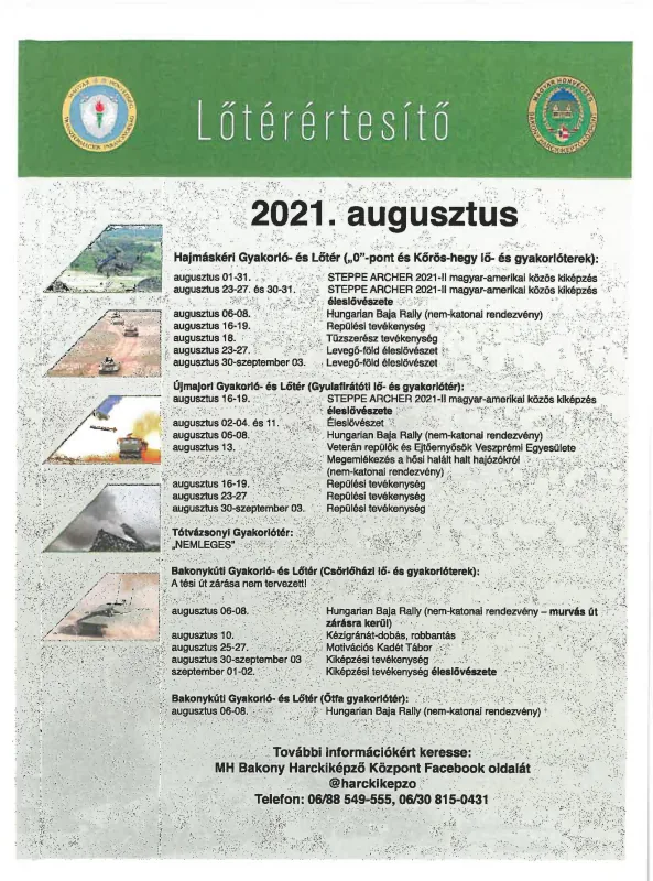 Lőtérértesítő Közszolgálati hír a MH Böszörményi Géza Csapatgyakorlótér Parancsnokság kezelésében lévő honvédségi területeken.