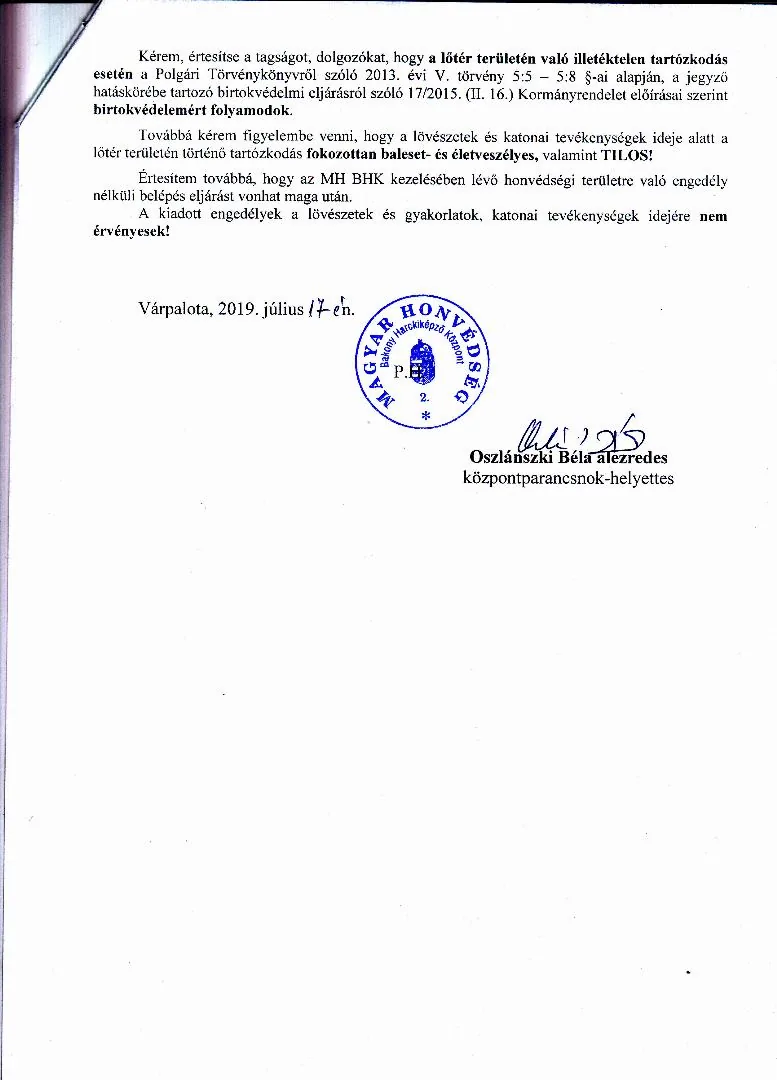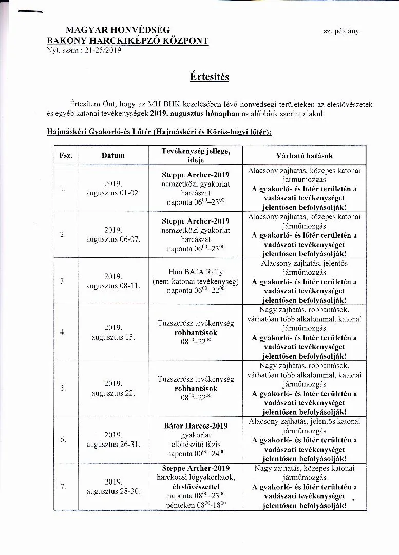 BAKONY HARCKIKÉPZŐ KÖZPONT honvédségi területein az éleslövészetek és egyéb katonai tevékenységek alakulása.