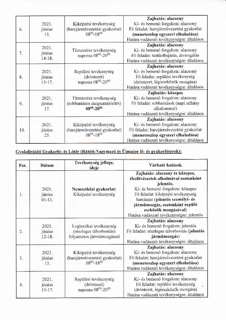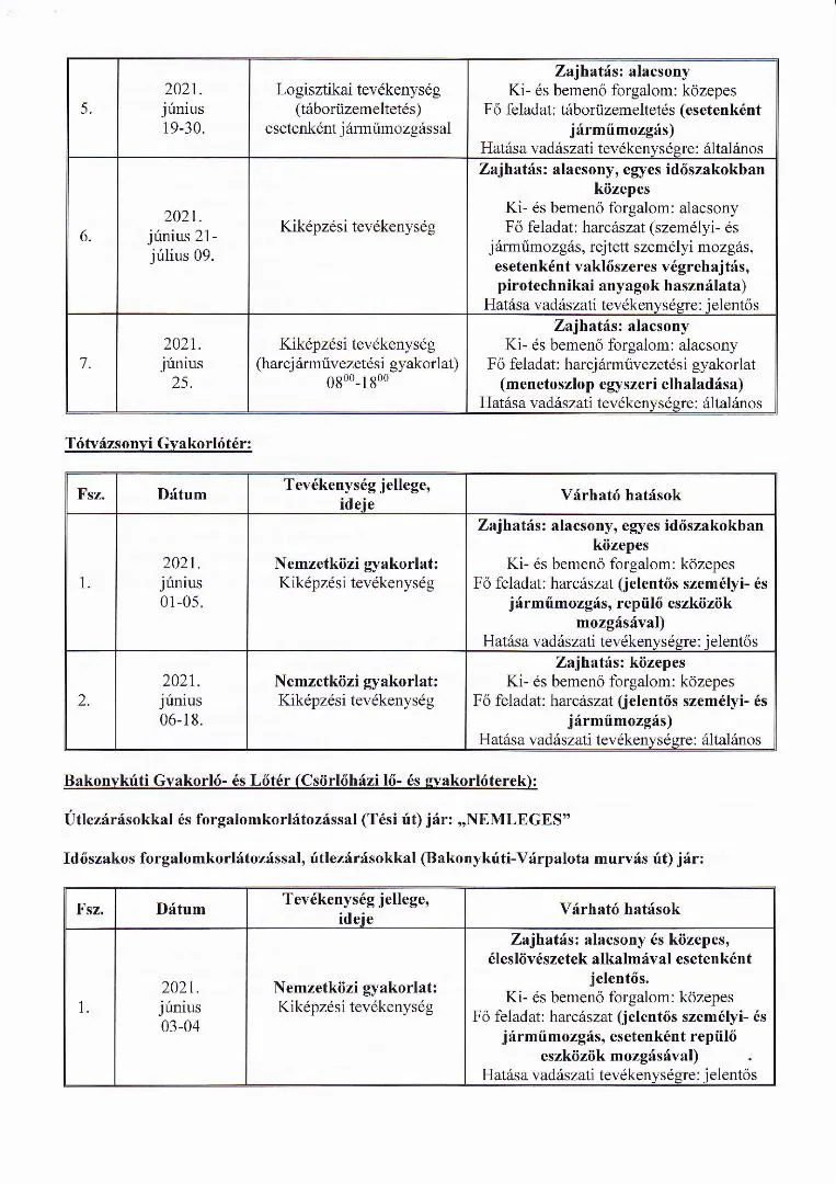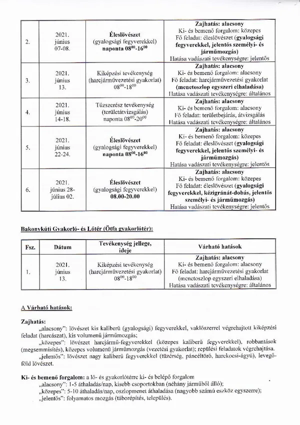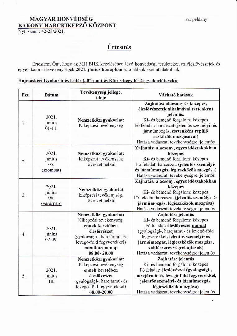 BAKONY HARCKIKÉPZŐ KÖZPONT honvédségi területein az éleslövészetek és egyéb katonai tevékenységek alakulása.