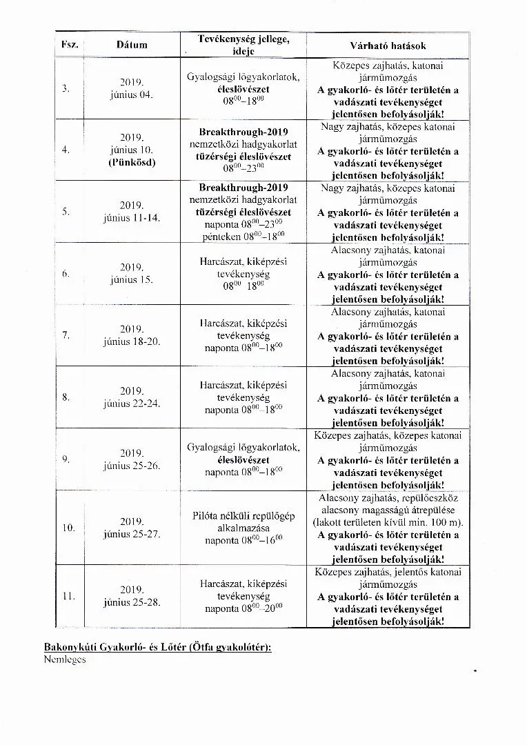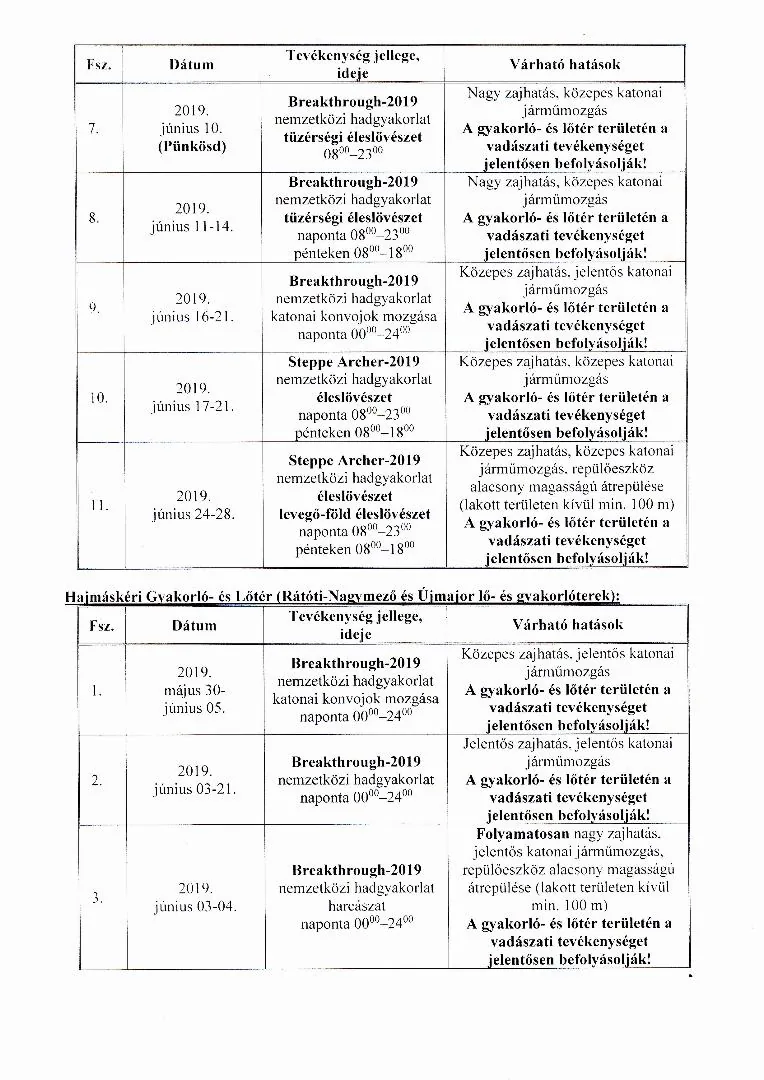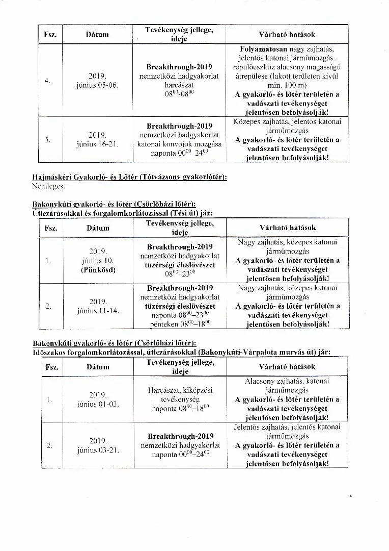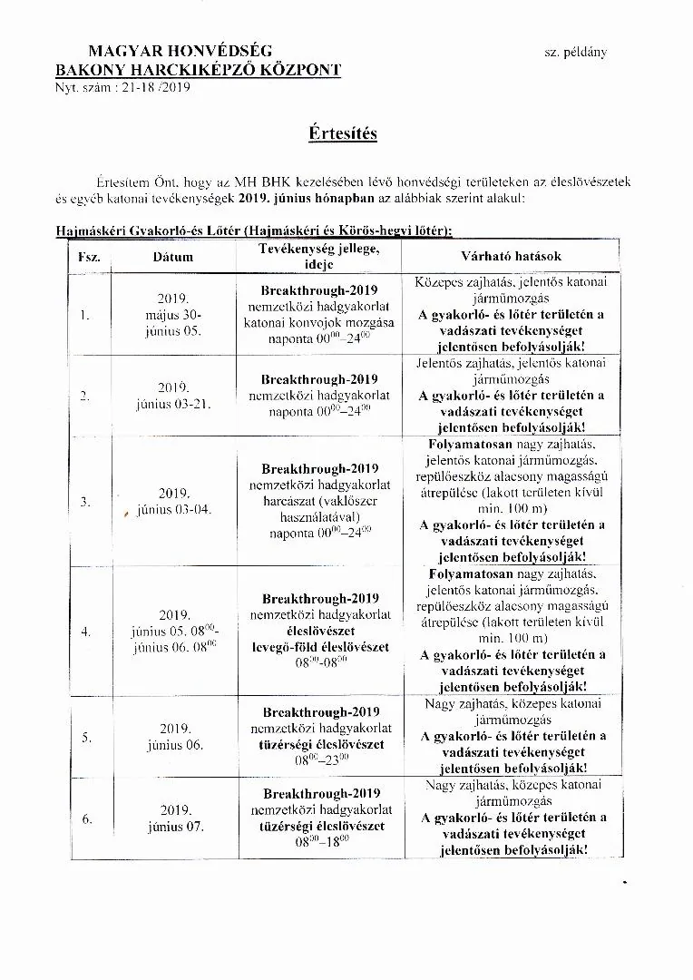 MH BHK 2019. június havi lőtérértesítő, Hajmáskér Kiképzőbázis tekintetében