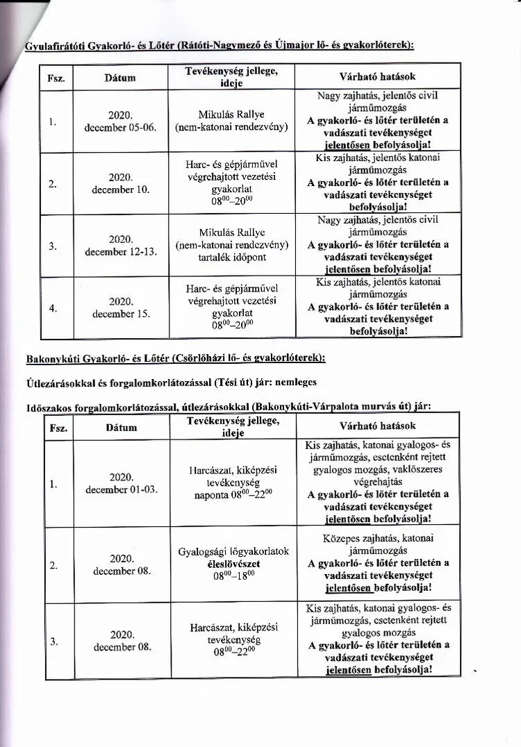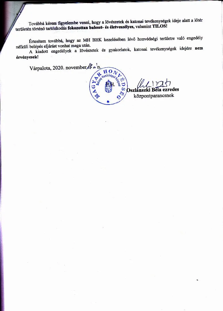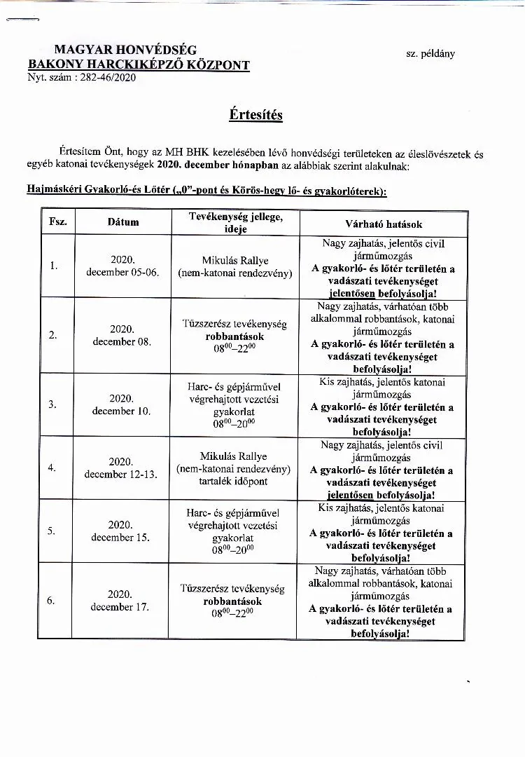 Lőtérértesítő Közszolgálati hír a MH Böszörményi Géza Csapatgyakorlótér Parancsnokság kezelésében lévő honvédségi területeken.