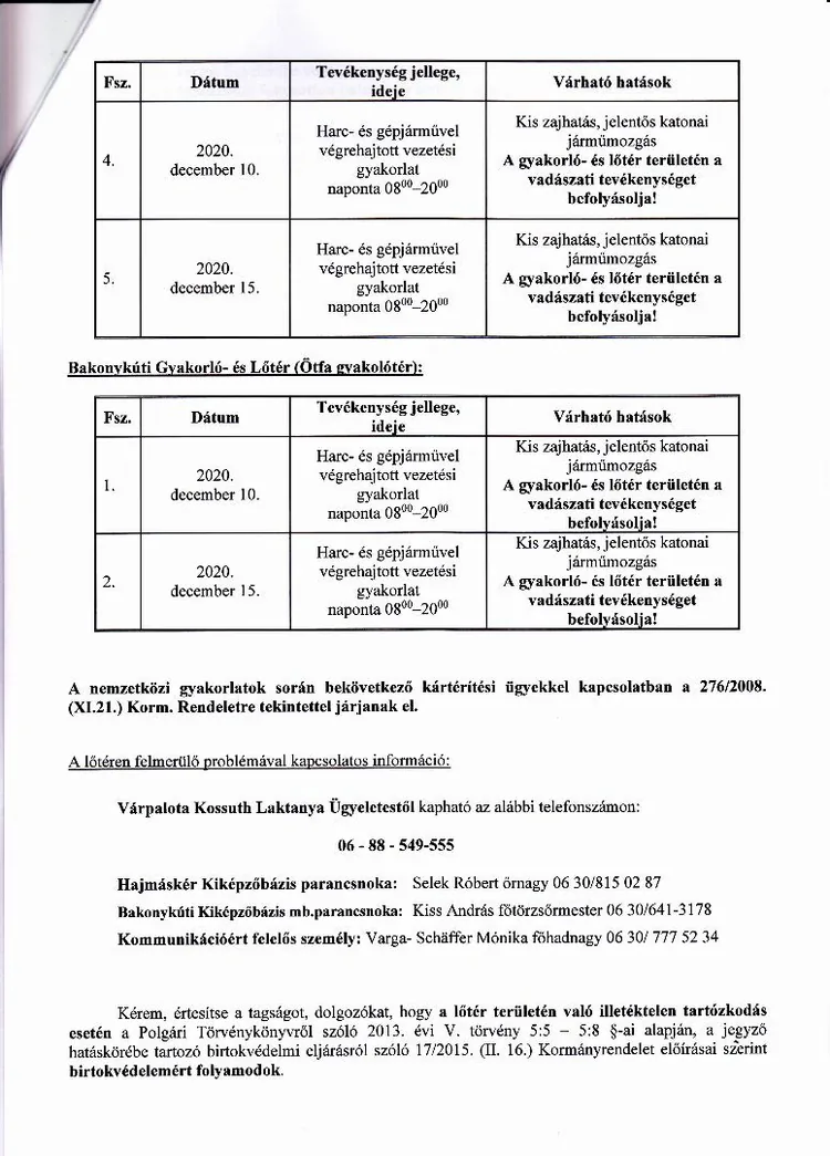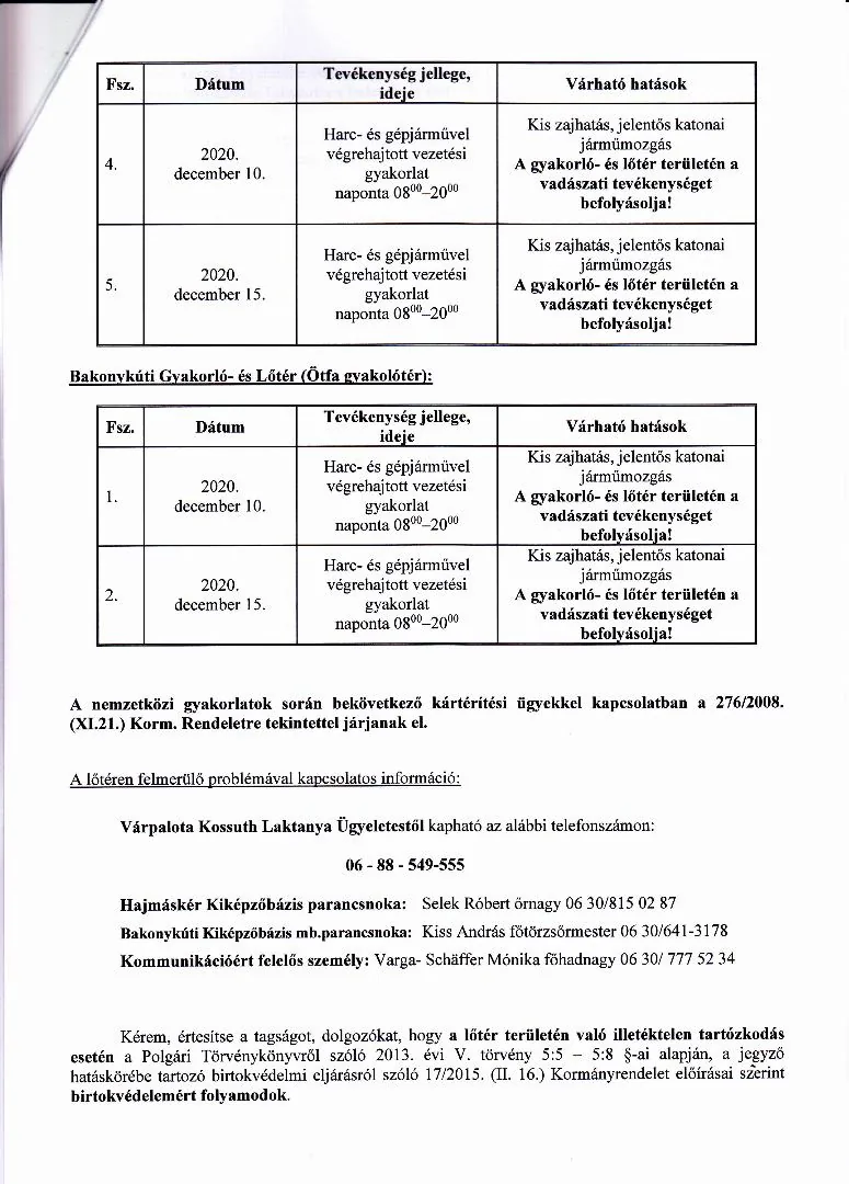 BAKONY HARCKIKÉPZŐ KÖZPONT honvédségi területein az éleslövészetek és egyéb katonai tevékenységek alakulása.