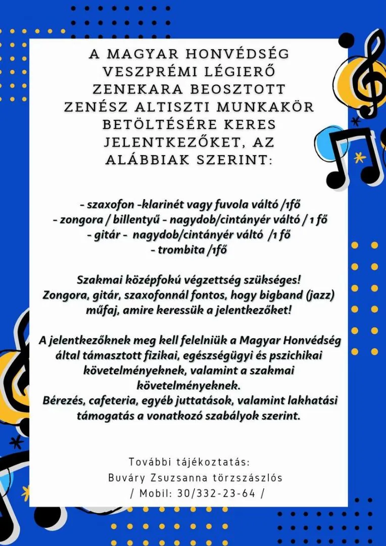 Beosztott zenész altiszti munkakör betöltésére keres jelentkezőket, főállású munkalehetőség.