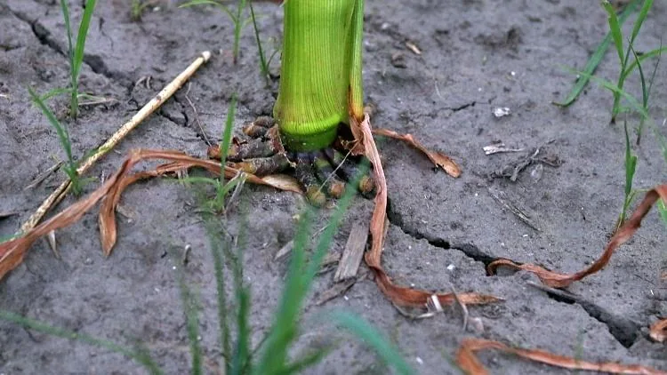 A csapadákhiány itt is érezteti hatását, csavarodnak a levelei, vagyis furulyál a növény a melegben, ez pedig azt jelenti, hogy szenved a kukorica.